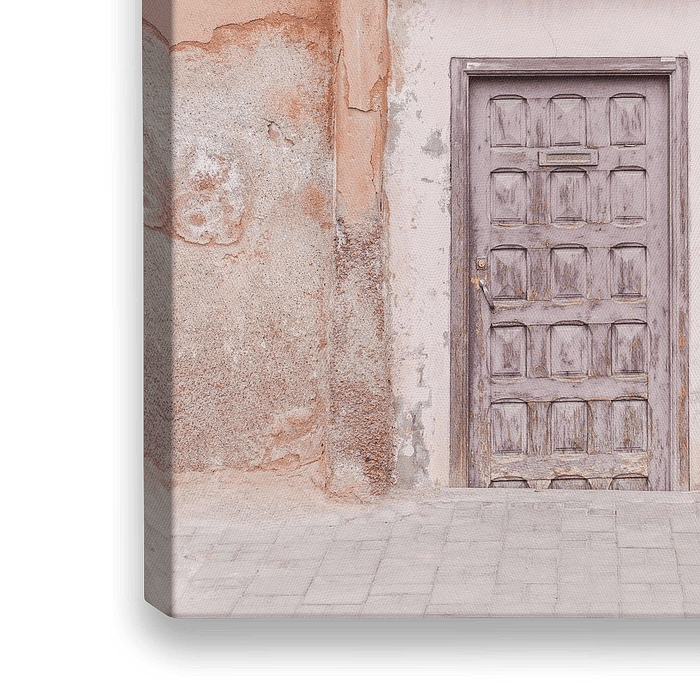 Een van de vele authentieke deuren in de oude medina van Marrakesh, Marokko. Samen met de muur vormt het geheel een blush en pastelkleurig palet met verschillende texturen.