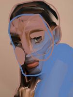 Abstract portret met de titel "Pastel mood" in pasteltinten: blauw, roze, bruin.