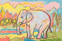 Een zacht getekende olifant staat tussen glooiende bergen en ranke dennen, terwijl een kronkelende rivier kleurige reflecties vangt. Brede, expressieve penseelstreken wisselen af met fijne contourlijnen, waardoor beweging en diepte ontstaan. Warme en koele tinten balanceren in een levendig contrast dat zowel speels als rustgevend…