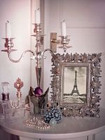 Zwart-wit foto van de beroemde Eiffeltoren in Parijs, Frankrijk in een vintage fotolijst, versierd met een kandelaar, wat retro sieraden en een roos.