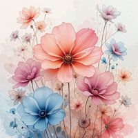 Een etherische aquarelafbeelding van een levendig bloemstuk, waar tere bloemblaadjes in zachtroze, serene blauwtinten en warme perziktinten zich ontvouwen in een harmonieus ballet. Zonlicht lijkt elke bloesem te doordringen, waardoor een doorschijnende gloed ontstaat die uitnodigt tot een gevoel van rust en zachte vreugde. Dit werk…