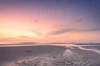 Foto van het strand in de avond. Op een windstille avond. De ribbels in het zand zijn zichtbaar. De foto is gemaakt in Scheveningen (Nederland),