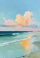 Dit olieverfschilderij toont een rustig strand in zachte pastelkleuren. De lucht is gevuld met roze en gele wolken die zachtjes weerspiegeld worden in het water. Dikke, zichtbare penseelstreken en ingetogen tinten creëren een minimalistische, dromerige stemming. Een helderblauwe lucht, zachte rimpelingen op het zand en zacht…