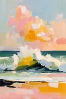Een rustig strand met pastelkleurige golven die zachtjes tegen de kust kabbelen, geschilderd in een impressionistische stijl. Zachte penseelstreken en warme kleuren vangen licht, beweging en sfeer. De lucht is gevuld met wolken in zachte roze en gele tinten en creëert een dromerige, vredige sfeer. De compositie straalt rust, ontspanning…