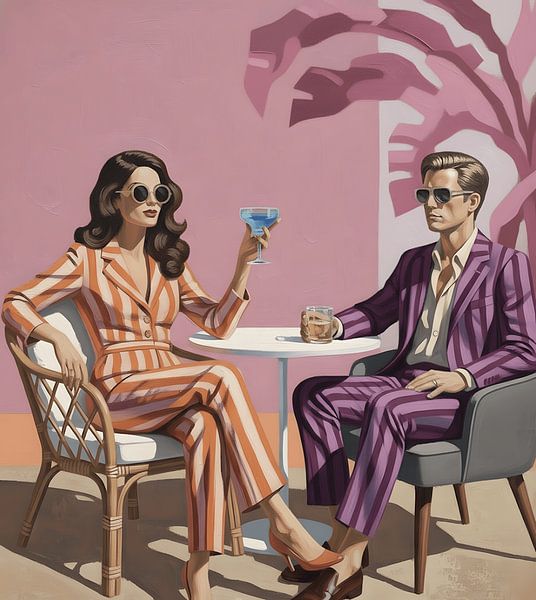 In deze stijlvolle terras scène zitten twee figuren tegenover elkaar, elk gekleed in uitgesproken strepen die hun persoonlijkheid benadrukken. De vrouw links draagt een zacht oranje met wit gestreept pak dat haar een warme, zonnige uitstraling geeft. Haar houding is ontspannen maar elegant: één arm rust op de armleuning van de rieten stoel, terwijl ze met de andere hand een helderblauwe cocktail omhoog houdt alsof ze proost op een zorgeloze dag. Haar golvende donkerbruine haar, ronde zonnebril en subtiele juwelen versterken haar filmische, bijna klassieke uitstraling.