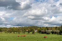 Burg-sur-Moselle France Pastoral scene in the northern French countryside. Cows graze below puffy cumulus clouds.