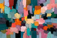 Een abstract kunstwerk met kleurrijke vormen in verschillende formaten en kleuren over elkaar heen gerangschikt als een lappendeken verwerkt met dikke penseelstreken waardoor het lijkt alsof een deel van elk kleurblokje wat diepte en dimensie toevoegt, wat een levendige en energieke sfeer geeft.