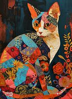 De ogen van de kat zijn bijzonder expressief; één oog toont een mix van groen en geel, terwijl het andere oog rood en oranje tinten heeft. Deze asymmetrie voegt een intrigerend element toe aan het portret. De collage bevat elementen van bloemen en organische vormen, en brengt een gevoel van natuur en levendigheid in het kunstwerk. Elk stukje van de collage lijkt zorgvuldig gekozen om bij te dragen aan het algehele mozaïek van kleur en vorm.