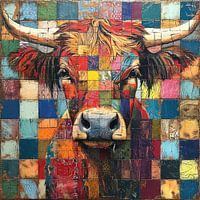 De ogen van de hooglander hebben een doordringende blik en zijn omringd door verweerde witte markeringen. De horens strekken zich statig uit, doorbroken door de lijnen van de panelen, wat een interessant visueel effect geeft.