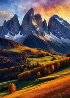 Dit prachtige beeld legt de majestueuze Paternkofel en de iconische Drie Torens vast in de Sexten Dolomieten, Zuid-Tirol, Italië, badend in de warme gloed van een herfstavond. De ruige bergtoppen, verlicht door het gouden zonlicht, steken prachtig af tegen de diepblauwe lucht, waardoor een adembenemend alpien tafereel ontstaat. Beneden strekt een levendig bos van groenblijvende en herfstkleurige bomen zich uit over glooiende heuvels, wat diepte en warmte toevoegt aan het landschap. Het tafereel straalt rust uit en toont de rauwe schoonheid van de Dolomieten, een UNESCO Werelderfgoedgebied dat bekend staat om zijn dramatische rotsformaties en verbluffende seizoensgebonden transformaties.