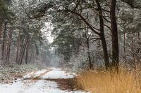 Pad op de 'grens' tussen de natuurgebieden 'Boshuizerbergen' (rechts) en 'Landgoed Geijsteren' (links) op een witte winterochtend in Venray (Noord-Limburg) .