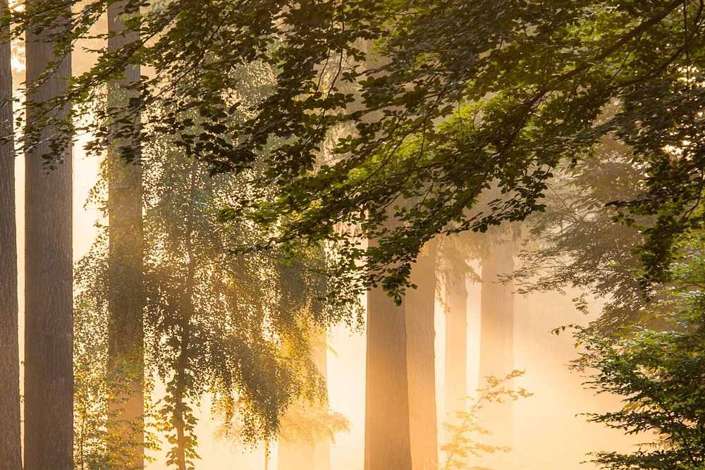 Het prachtige bos op de Veluwe op een heel vroeg tijdstip, waarbij de opkomende zon haar stralen tussen de bomen door laat zien. De mist, ontstaan door de regen van de vorige dag, geeft het bos een serene, mysterieuze uitstraling. De natuur op zijn mooist.