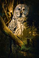 Path of Wisdom, pad der wijsheid. De uil, in dit werk, een strix nebulosa , bewaakt hier, een door het landschap slingerend, fietspad. De zonsopgang zorgt voor de warme atmosfeer en dito kleuren. De kleuren van deze Lapland uil en het landschap, zijn goud, bruin, groen en crème. Deze kleuren zijn hier in meerdere tinten aanwezig.