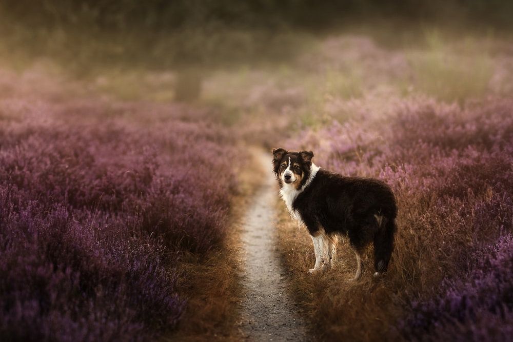 Australian shepherd op de heide tijdens een warme zonsopkomst