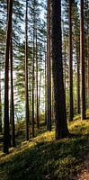 Pad op een heuvel tussen de naaldbomen in een national park van Finland. Mooie belichting van zonsopkomst door de bomen.