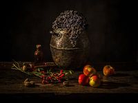 Een stilleven in de stijl van de oude meesters: een oude verweerde koperen pot, met de hand geslagen, met een gedroogde dadeltak, Rozenbottels, walnoten, appels en oude apothekersflesjes op een houten graankist. De sobere belichting geeft het werk iets nostalgisch.
