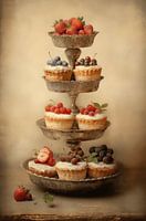 Dit sfeervolle kunstwerk is een smakelijke weergave van een klassieke, zilveren gebaksschaal, gevuld met prachtig gedecoreerde fruitgebakjes. De compositie heeft een schilderachtige, bijna nostalgische uitstraling die doet denken aan de stillevens van Hollandse meesters, maar dan met een moderne twist.