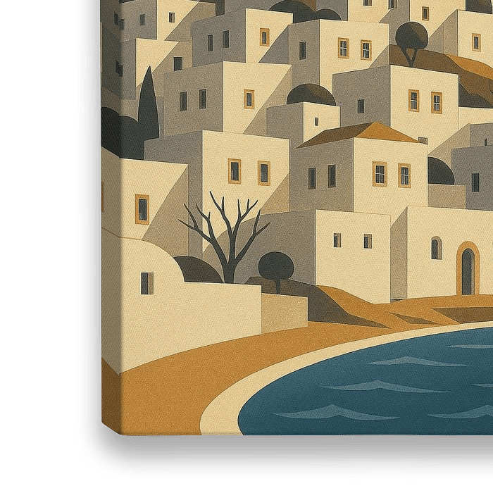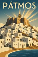 Deze art-decoposter van Pátmos geeft de unieke sfeer van het eiland weer, waar geschiedenis en spiritualiteit elkaar ontmoeten. Het kunstwerk belicht het op een heuvel gelegen Sint-Jansklooster, met uitzicht op witgekalkte huizen die trapsgewijs afdalen naar de kustlijn. Gestileerde stralen van goudkleurig zonlicht verlichten de scène en vermengen de architectonische schoonheid met het dramatische Egeïsche landschap. Bekend als het "Eiland van de Apocalyps", draagt Pátmos een diep cultureel en spiritueel erfgoed met zich mee, waardoor het een bestemming is van zowel sereniteit als betekenis. Het vintage ontwerp van de poster, de gedurfde geometrie en de harmonieuze kleuren zorgen voor een opvallend kunstwerk dat naadloos past in moderne interieurs. Ideaal voor wie houdt van Cycladische landschappen, religieuze geschiedenis of tijdloze reisposters, dit stuk voegt elegantie en diepte toe aan elke muur. Of het nu in een woonkamer, creatieve ruimte of persoonlijke galerie hangt, de Pátmos-print viert de spirituele energie en blijvende architecturale charme van het eiland met Art Deco raffinement.