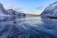 Mooie patronen ontstaan door de getijde werking op het strand in een Noors fjord. Aan weerszijden rijzen de bergen op. Een dorpje ligt rechts te wachten op de ochtend. De kleuren van de lucht worden weerspiegeld op het water in de kleine geulen.