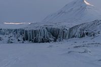 De drop-gletsjer op Svalbard de sterke compressie in het ijs duwt de zuurstof uit het ijs en zorgt ervoor dat het ijs op sommige plaatsen bijna zwart lijkt.