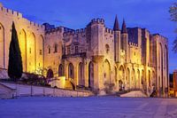 Het verlaten pauselijk paleis in het centrum van Avignon tijdens het blauwe uur op een lenteavond.
