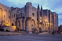 Het verlaten pauselijk paleis in het centrum van Avignon tijdens het blauwe uur op een lenteavond.