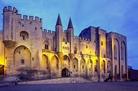 Het verlaten pauselijk paleis in het centrum van Avignon tijdens het blauwe uur op een lenteavond.