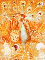 Een expressionistische illustratie van een pauw in geselecteerde regenboogkleuren op een prachtige achtergrond.