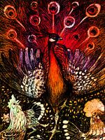 Een expressionistische illustratie van een pauw in geselecteerde regenboogkleuren op een prachtige achtergrond.