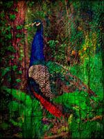 Dit is Indie, een wilde pauw die enkele maanden bij ons thuis in Italië heeft gewoond. De individuele blauwe veren waren prachtig! Hij had favoriete zitstokken om te poetsen en de veren vielen naar beneden, die ik verzamelde en gebruikte in collageschilderijen. Ik nam een foto van hem en maakte dan dit prachtige fotokunstportret. Hij was nogal een karakter. Als hij honger had tikte hij op ons raam om de aandacht te trekken. Hij was op zoek naar een partner, maar vond alleen katten bij ons thuis. Hij toonde zich naar hen, voor het geval dat, maar natuurlijk tevergeefs. De kittens achtervolgden zijn staart en hij was heel voorzichtig met hen. Uiteindelijk, zonder romantiek in zicht, ging hij elders verder in zijn zoektocht naar liefde.