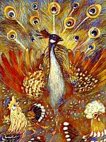 Een expressionistische illustratie van een pauw in gouden, gele en groene tinten tegen een prachtige achtergrond.