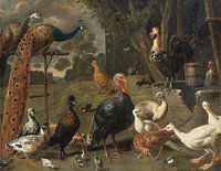 Pauw en pauwen op een baars, kalkoenen, een fazant en gevogelte bij een waterput, Adriaen van Utrecht