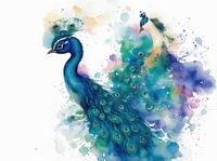 een abstract waterverf beeld van een pauw in mooie pastelkleuren.