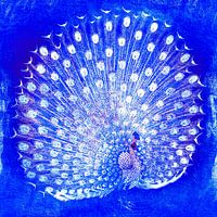 Een expressionistische illustratie van een pauw in blauwe kleuren tegen een prachtig geschilderde achtergrond met zachte textuur.
