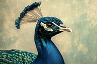 Deze close-up van een pauw onthult de verbluffende textuur en kleurweelde van zijn verenkleed, met iriserende blauwtinten en een fascinerende koptooi die fier oprijst. Het oog, scherp omlijnd en vol diepte, trekt onmiddellijk de aandacht en geeft de compositie een intens karakter. De zachte, neutrale achtergrond benadrukt de visuele rijkdom van de pauw en brengt zijn natuurlijke elegantie volledig tot zijn recht. Dit kunstwerk straalt koninklijke pracht uit en is een stijlvolle toevoeging voor elke ruimte die luxe en natuur wil combineren.