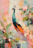 Een olieverfschilderij toont een prachtige pauw in een weelderige tuin, gerealiseerd met abstracte elementen en een levendig pastelkleurenpalet van roze, groen, oranje, blauw en paars. Gedetailleerde penseelstreken leggen de delicate bloemen en planten in de tuin vast, waardoor het werk diepte, textuur en dynamiek krijgt. De harmonieuze…