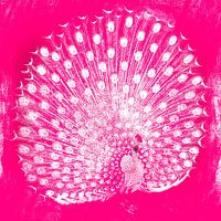 Een expressionistische illustratie van een pauw in roze kleuren tegen een prachtig geschilderde achtergrond met zachte textuur.