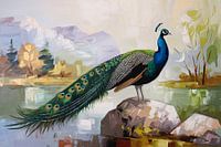 Dit schilderij vangt de gracieuze schoonheid van een pauw die trots poseert te midden van een serene, natuurlijke omgeving. De veren, levendig met groene en blauwe tinten en de kenmerkende 'ogen', contrasteren prachtig met de zachte, pastelkleurige achtergrond van bergen en bomen. Dit kunstwerk is een tijdloze toevoeging aan elk interieur en voegt zowel elegantie als een vleugje natuur toe. Het past perfect in een klassieke of moderne woonkamer, waar het als blikvanger kan dienen. De zachte penseelstreken en de subtiele kleuren zorgen voor een rustgevende sfeer, ideaal voor ontspanning en contemplatie. Het is een perfecte keuze voor iedereen die houdt van verfijnde kunst en de schoonheid van de natuur.