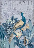nostalgische kunstcollage met pauw in een exotische vegetatie en typografische elementen