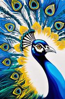 Dit levendige en kleurrijke ontwerp toont een prachtig gestileerde pauw met zijn kenmerkende schitterende veren. De gedurfde kleurencombinatie van blauw, geel, en groen brengt de pracht van deze vogel perfect tot leven. Het ontwerp straalt energie uit en trekt onmiddellijk de aandacht door de dynamische compositie en moderne benadering…
