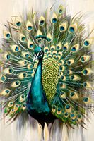 Dit prachtige ontwerp brengt de elegantie en schoonheid van een pauw op een unieke manier tot leven. De indrukwekkende details van de pauwenveren, met een mix van heldere tinten groen, blauw en goud, maken dit schilderij een echte blikvanger. Ideaal voor elke ruimte die een vleugje verfijning en natuurinspiratie nodig heeft. Dit kunstwerk straalt een tijdloze charme uit en voegt een kleurrijke en dynamische energie toe aan elk interieur. Perfect voor liefhebbers van dieren en kunst die een statement willen maken.