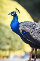 Close up van een mannelijke pauw op een Arabische paardenfokkerij.