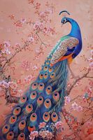 Een pauw zit op een sierlijke tak, omgeven door een overvloed aan bloeiende roze bloemen. Het kunstwerk vangt de gratie van de pauw in al zijn pracht, terwijl de kleuren van zijn verenpracht schitteren in het licht.