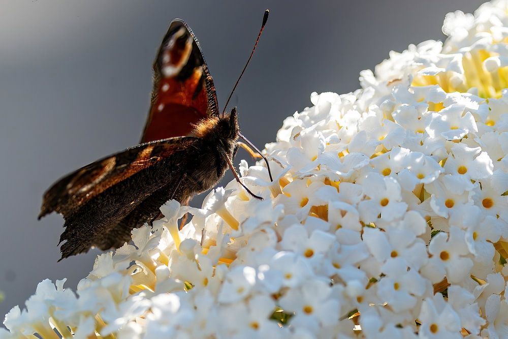 Ontdek de levendige schoonheid van de pauwvlinder op een witte vlinderstruik! Deze foto vangt het perfecte samenspel van kleuren en vormen: De stralende oogvlekken van de vlinder voegen een vleugje elegantie en gratie toe aan de tere sering. Terwijl de pauwoogvlinder zachtjes neerstrijkt op de bloemen, speelt hij een belangrijke rol in de bestuiving en draagt hij bij tot de pracht van onze tuinen. Laat je inspireren door dit harmonieuze landschap en geniet van de diversiteit en fascinerende ontmoetingen in de natuur. Perfect voor iedereen die houdt van de magische wereld van vlinders en bloemen!