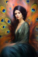 Fotomodel met donker haar met prachtige galajurk en veren van een pauw om het plaatje compleet