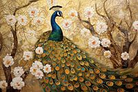Dit werk is een betoverende close-up die de majestueuze pracht van een pauw op een abstracte wijze viert. De compositie is een wervelwind van diepe, juweelachtige kleuren, waarin koningsblauw, smaragdgroen en levendig turkoois naadloos in elkaar overvloeien. De dynamische, vloeiende lijnen en patronen roepen de textuur en de iriserende glans van de veren op, zonder ze letterlijk weer te geven. Het creëert een gevoel van luxe, diepte en beweging, alsof je wordt meegevoerd in de pronkveren van het dier. De focus ligt volledig op de intense kleurbeleving en de elegante vormen, wat het werk een krachtige en tegelijkertijd verfijnde uitstraling geeft. Het is een perfecte blikvanger voor een interieur dat vraagt om een vleugje extravagantie en natuurlijke schoonheid, en het voegt een sfeer van weelde en verwondering toe aan elke muur.