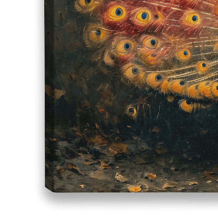 Een muurschildering als decoratieve kunst voor een stijlvol interieur. Een pauw pronkt met zijn prachtige verenkleed.