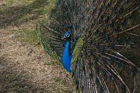 Een mannetjes pauw spreidt zijn veren om een vrouwtje te verleiden.