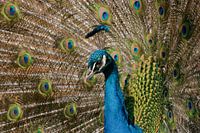 Portret van een trotse Pauw in daglicht die mooi stond te wezen.Hij had zijn veren helemaal uitgespreid wat een prachtige opname opleverde.