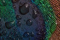 "Pauwblauw: Het oog van een pauwenveer met druppels" is een macrofoto van een pauwenveer met daarop waterdruppels. Door het belichten van de veer, komen de mooie glanzende kleuren naar voren.